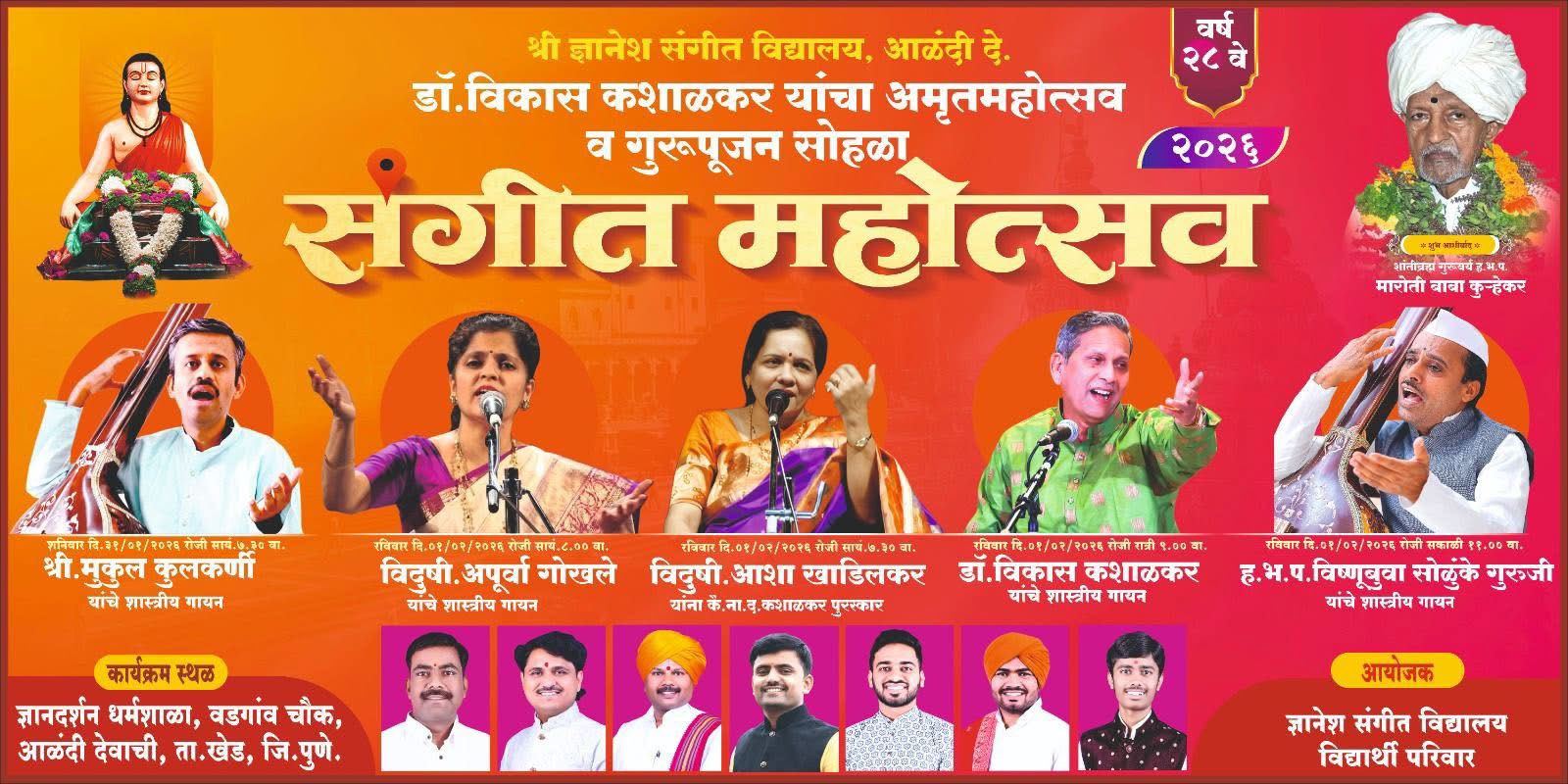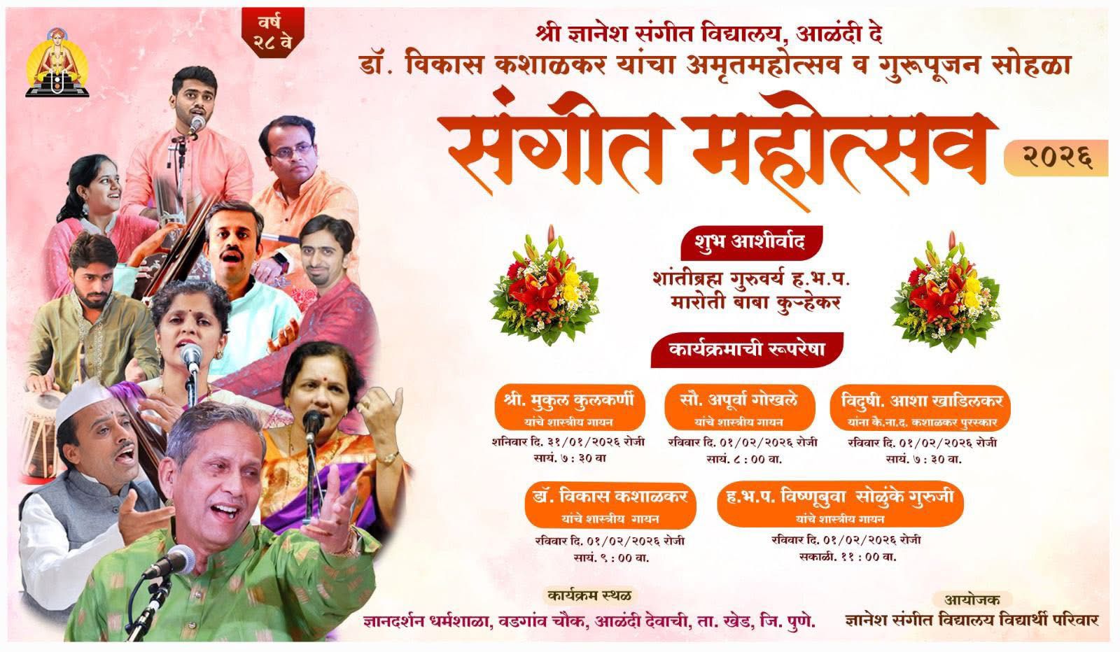 | 4. | Sangeet Mahotsav, Alandi organised by Shri Dnyanesh Sangeet Vidyalay. | February 1st 2026 | 8.00 am onwards | Dnyandarshan Dharmashala, Vadgaon Chowk, Alandi | Tabla :- Hrishikesh Survase Harmonium :- Pravin Kaslikar |